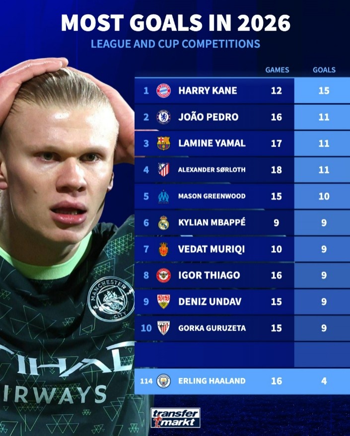 3月12日讯 德转盘点了在2026年五大联赛球员在联赛+杯赛进球榜,其中凯恩15球居首,而哈兰德仅打进4球只位列第114位。具体如下: